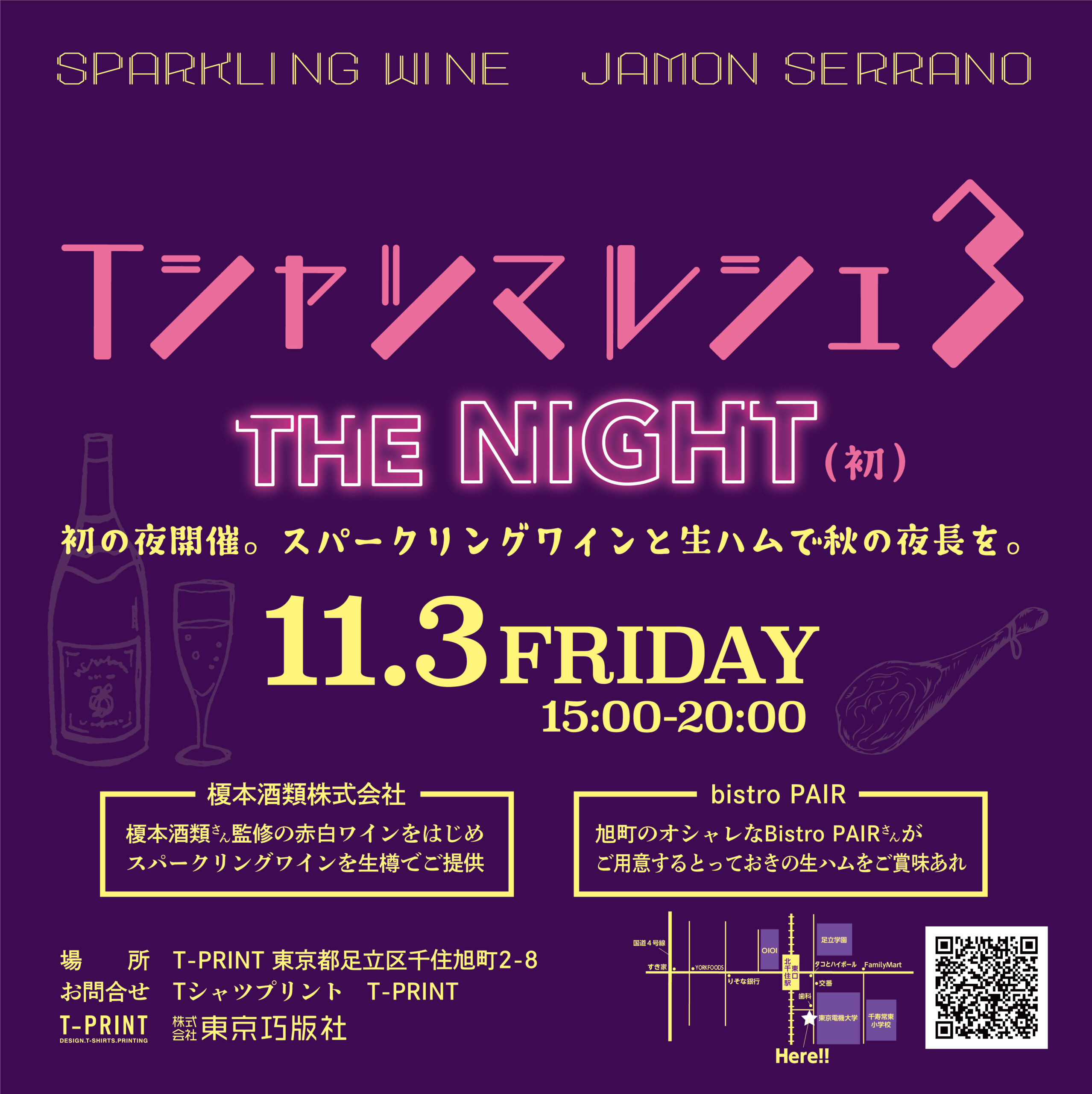 Tシャツセールはもちろん、ワークショップもあり、何よりワインとスパークリングと生ハムなど美味しいおつまみも揃います!