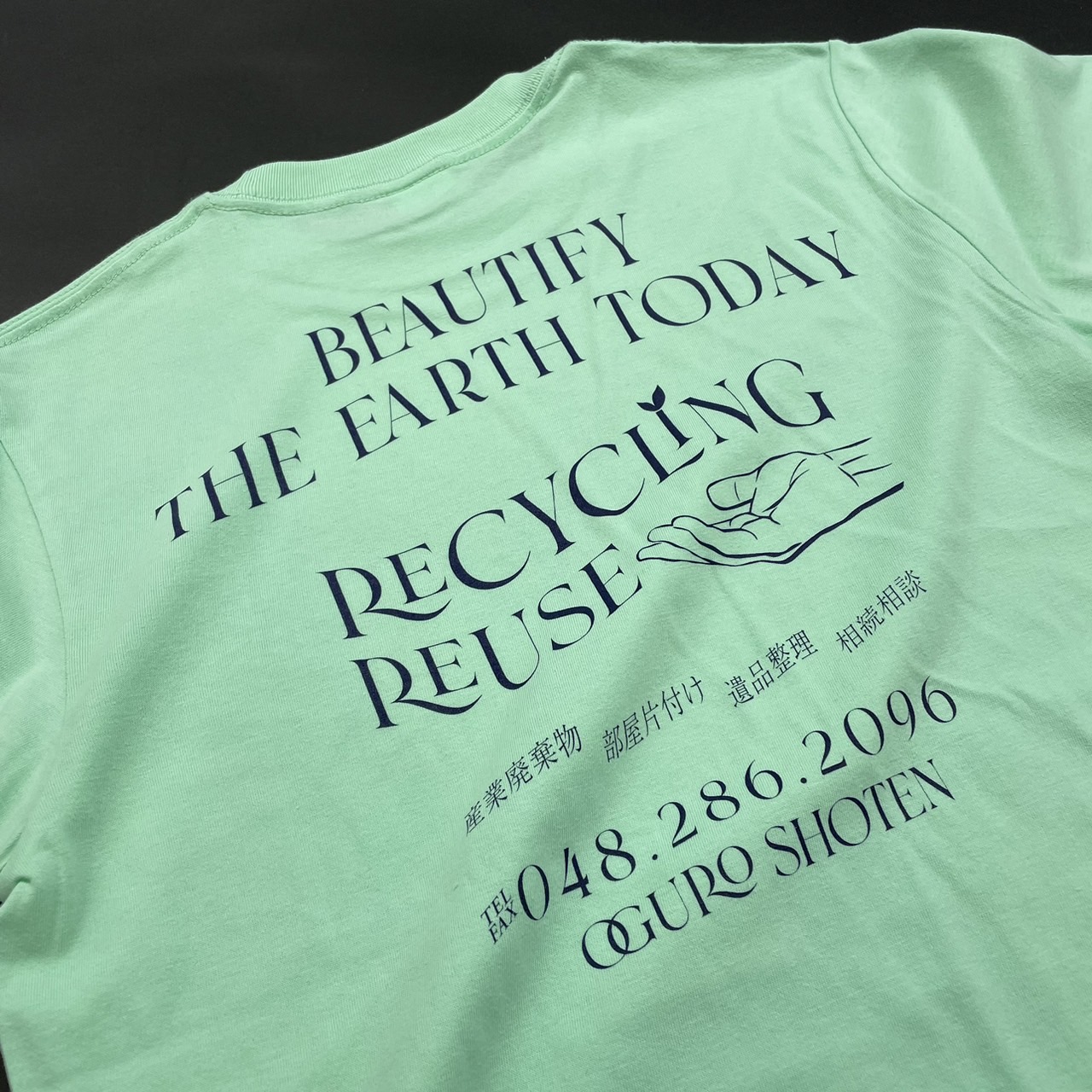 「今日の地球を美しく」というテーマのもと、古紙回収などにも注力し、リサイクルやリユースを推進する会社様です。Tシャツの色も明るくクリーンな黄緑を選択し、あまり重たくないデザインをご希望されておりました。